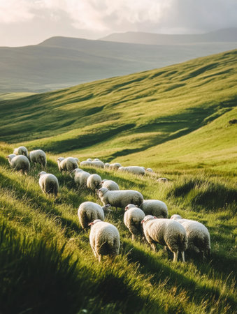 A flock of sheep migrates peacefully through verdant hills as soft morning light illuminates the landscape, creating a serene rural atmosphere.