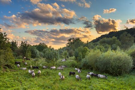 Herd of cows grazing on meadow in mountains at sunset.