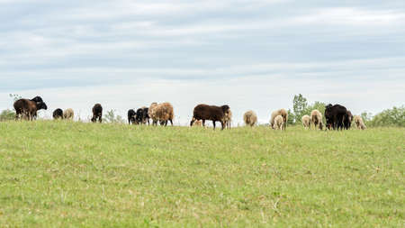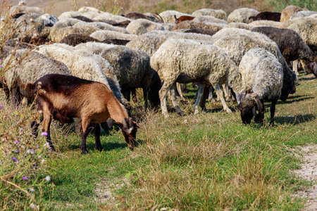 Sheep and goats graze in the meadow. Selective focus. Nature.