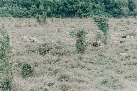 Sheep in the pasture in the valley. Background with copy space for text or inscriptions. Selective focus