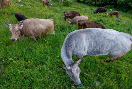 Herd of cattle grazing in the green meadow in the mountains