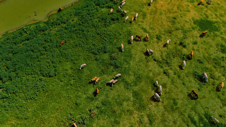 Aerial photography ducumentary Herd of cows grazing on the meadow near the lake at sunset