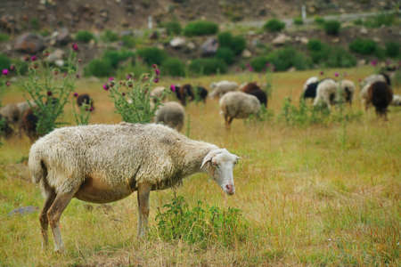 Herd of sheeps and goats in mountains on Georgia, Caucasus. Toned picture