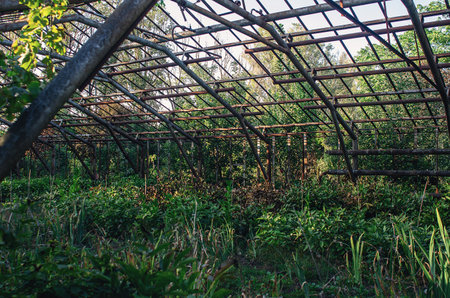 Abandoned greenhouse. Roof of old greenhouse with rusty metal ceilings. Weeds on beds between flowers
