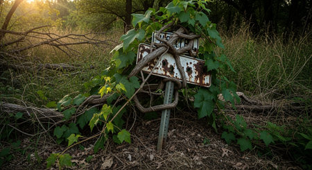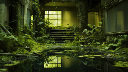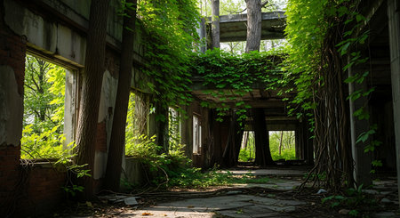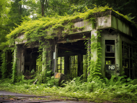 Verdant foliage envelops the facade of an abandoned building, creating a striking juxtaposition of nature and man-made structure. illustrates urban decay and the relentless force of nature in reclaiming its territory. Generative AI