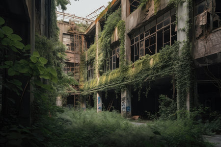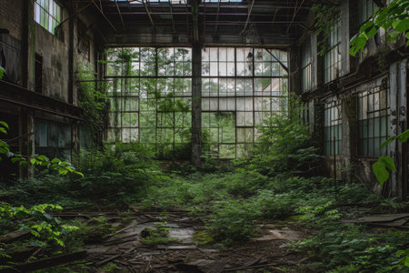 ruined factory with broken windows and crumbling walls, surrounded by overgrown greenery, created with generative ai