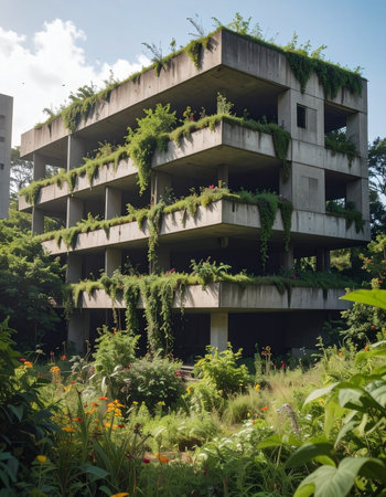 A once-imposing brutalist structure now stands silent, its stark concrete lines softened by a relentless tide of green.