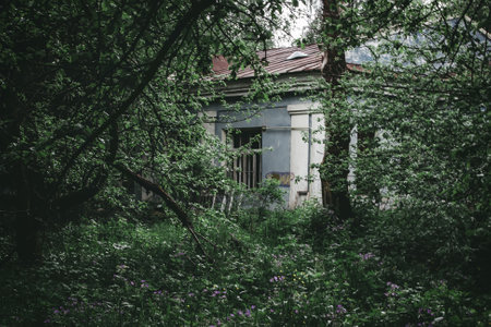 The haunted building has been abandoned for a long time, filled with plants and wild grass. horror and mystery concept