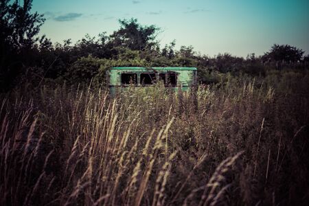 Abandoned metal trailer with barred window and high grass