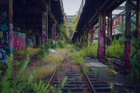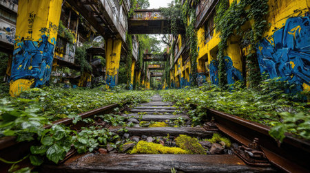 An abandoned railway track winds through an industrial building, overtaken by lush greenery. The structure's pillars display vibrant blue and yellow graffiti, contrasting with the natural environment. The image evokes a sense of decay and renewal, potentially suitable for editorial content or creative projects.