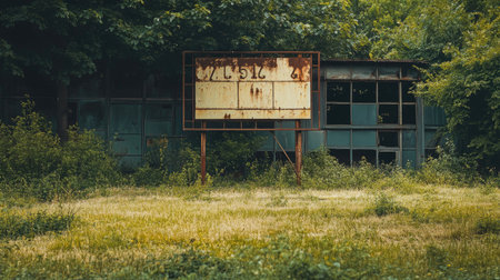 An abandoned football field with overgrown grass and a rusted scoreboard, evoking a nostalgic atmosphere