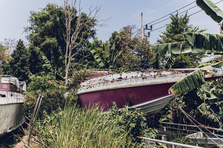 Old and rusty motor boats on a landfill surrounded by tropical forest