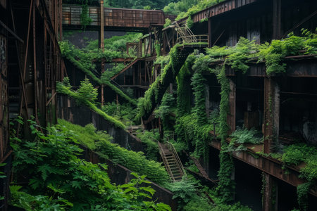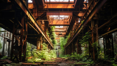 Abandoned factory overgrown by vines, symbolizing trade shifts, factories can shut down. old industry concept.