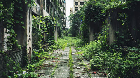 An overgrown, deserted street flanked by dilapidated buildings. Greenery has taken over, growing through cracks in the pavement and up the sides of the buildings. The scene evokes a post-apocalyptic atmosphere.. AI Generation