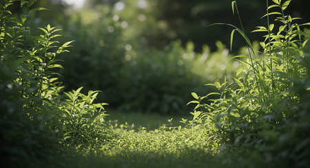 A sunlit pathway winds through dense, lush green grass and overgrown plants, with soft focus and bokeh creating a tranquil, dappled light effect.