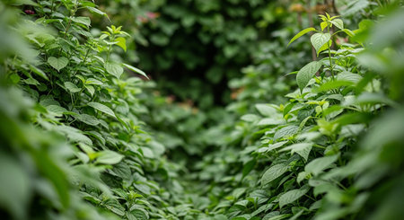 A dense pathway of vibrant green leaves and foliage creates a natural tunnel effect with soft focus in the background and dappled sunlight.