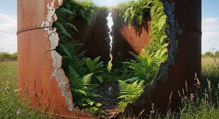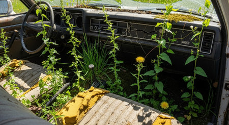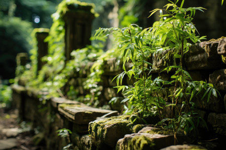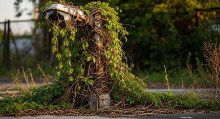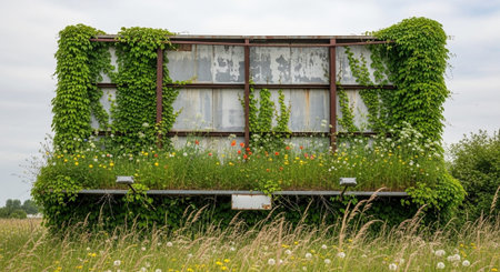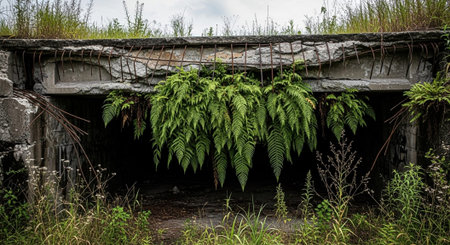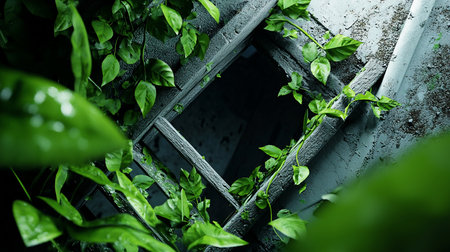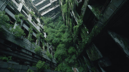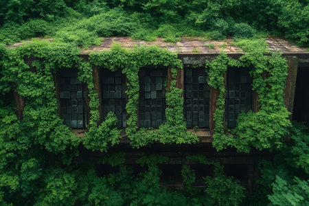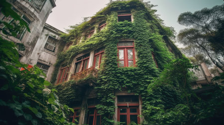 Verdant foliage envelops the facade of an abandoned building, creating a striking juxtaposition of nature and man-made structure. illustrates urban decay and the relentless force of nature in reclaiming its territory. Generative AI