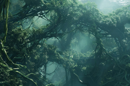 A mesmerizing illustration of a surreal forest with intricately twisted branches and lush greenery, creating a magical and mysterious atmosphere.