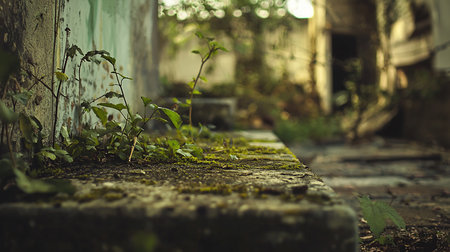 Close-up of moss-covered concrete in an abandoned building, with vibrant green plants emerging. Soft, diffused light creates a serene yet melancholic mood, highlighting nature's resilience.