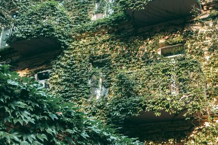 Climbing green plants on the facade of an old building