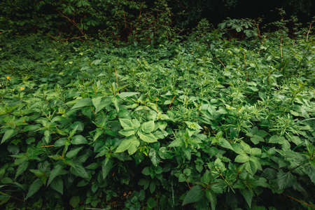 Green leafs of Urtica dioica - nettle in the forest in rainy day. Stinging and growing nettle - medical plant. Wide angle - dark photo of many nettle in the dark forest.