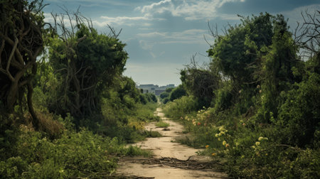 Roman road reclaimed by nature in a post-apocalyptic world covered in vegetation