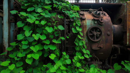 This image captures an abandoned industrial machine engulfed in vibrant green vines, showcasing nature's reclaiming power in a forgotten warehouse setting.