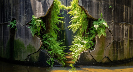 A decayed grey wall featuring a massive irregular hole, overgrown plants spilling through, creating a contrast of urban decay and nature