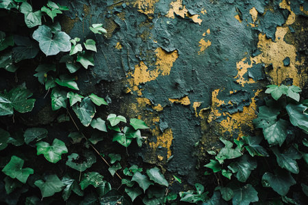 Vine of dark green leaves growing up dirty abandoned wall