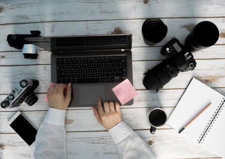 Photographer's hand using a laptop trackpad on a wooden desk, surrounded by a vintage camera, coffee cup, and gear, representing creative work and professional workspace from a top view