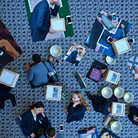 This image captures an overhead view of several people seated on a patterned floor, engrossed in their activities. The setting appears to be a casual working or meeting space, indicated by the presence of laptops, smartphones, and framed items scattered about. There are posters of a person in formal attire, suggesting the theme might be business or a conference. One individual is holding a framed picture, while others are engaged in conversation or on their devices. The varied positions and expressions of the people indicate a relaxed yet focused atmosphere. The presence of a purple bag adds a splash of color to the otherwise muted environment.