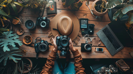 Overhead view of a person holding a camera, surrounded by various photography equipment on a rustic wooden table, emphasizing a creative workspace.