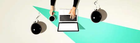 Top view of a freelancer's workplace with a computer on a desk in an ecological style.