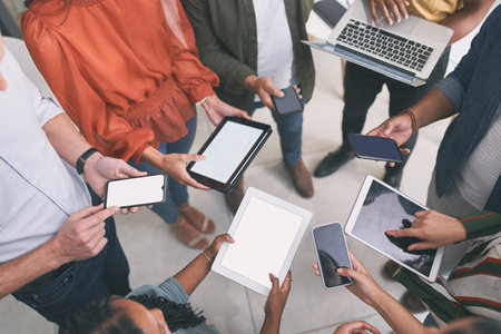 Generative AI : Top view of diverse people of creative team group using smartphone tablet and computer laptop Overhead of asian young creative start up meeting Have copy space for