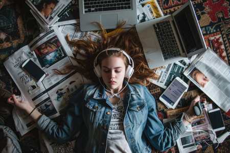 A top view of a Scandinavian teenage female lying on the floor with many electronic devices. Generative AI AIG30.