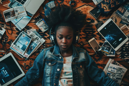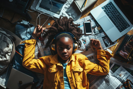 The top view of picture that about young african american human laying down and listening to the music and focused in the full of the thought and music with room that surrounded with devices. AIGX03.