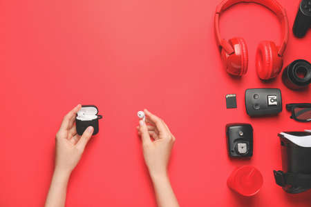 Ukraine Dnipro 11/30/2021 - Smart watch Samsung Galaxy Watch and Headphones Huawei Freebuds 4i and Apple iPhone 11 and GoPro Hero 9, technologies