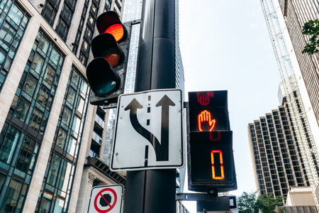 A close-up of traffic signs and signals at a busy intersection, illustrating traffic management in the city.