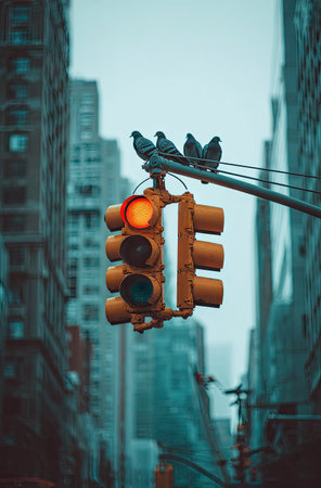 An image showcases a traffic light with birds perched atop against a backdrop of towering city structures. The composition displays a vertical format, with muted tones and soft lighting suggesting an urban setting. The photograph could be used for various purposes, including editorial content or commercial projects.