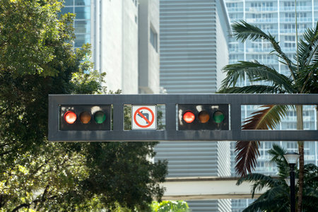Traffic lights regulating driving cars on city street in Miami, Florida