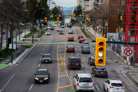 Downtown Vancouver, British Columbia, Canada - December 31, 2018: Aerial view on the busy streets in the city.