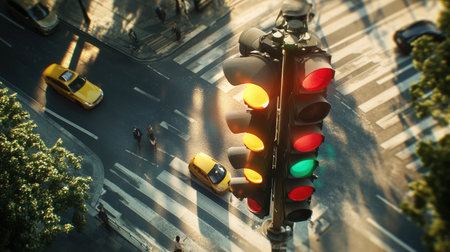 Aerial view of traffic lights changing with yellow taxis on a busy city street. Captures urban life and transportation dynamics in a vibrant setting.