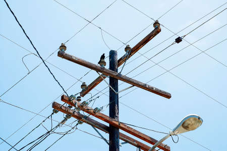 Old wooden pole, with a wiring harness, power lines, telephone, cable TV against a blue sky. A mess of wires on a pole