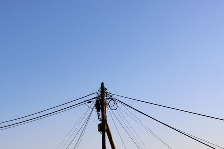 Pillar with wires of high voltage and pillar with streetlight on background of blue sky. Background image of many wires in sky with copy space. Group of power lines.