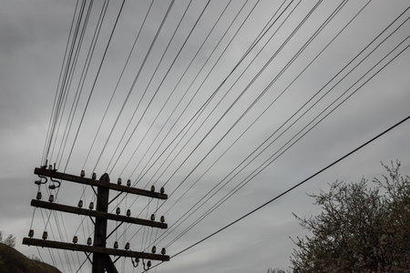 A dense network of power lines and cables stretches across a utility pole under a gray sky, illustrating urban infrastructure and connectivity in modern environments.