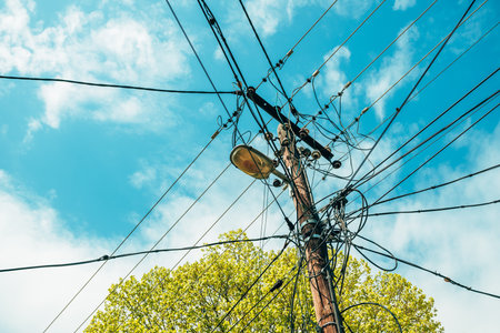Messy tangled overhead cable wires on utility pole in urban city infrastructure.