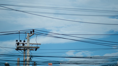 Electricity cable on the pole with fluffy clouds and sky on blue tone background