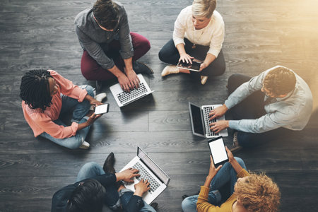 Creative, modern group of casual business people, sitting with laptop and brainstorming on presentation meeting. Overhead view of team of employees sitting on office floor, working on ideas together