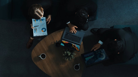 Top down aerial view of skilled female investor holding financial chart while attending a meeting where a smart manager discusses marketing strategy and compares financial investment data report.