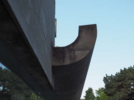 Concrete architectural structure with smooth surfaces and crisp lines, against a bright, cloudless blue sky.